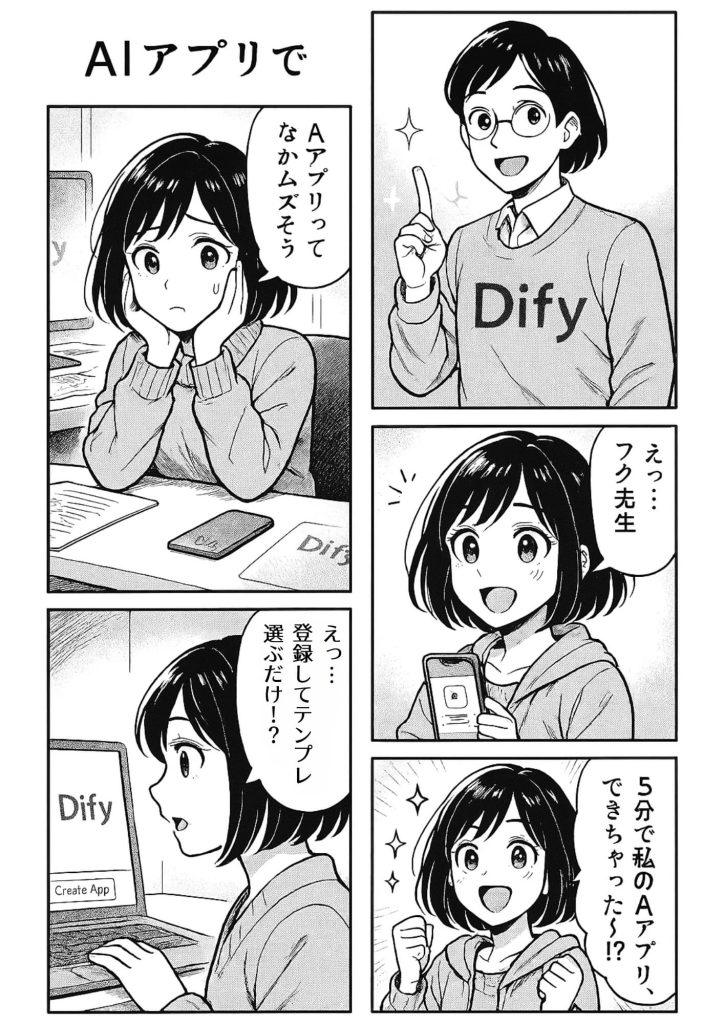 一番驚いたのは、Difyで作ったAIアプリがすぐに共有できること!友達に自作AIのURLを送ったら大好評だったよ